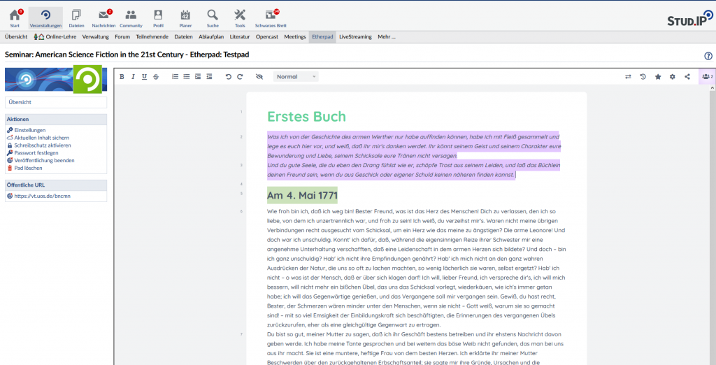 Im Menü links können Sie Ihr Dokument veröffentlichen und die dann angezeigte URL weitergeben, so dass auch außerhalb von Stud.IP damit gearbeitet werden kann. Hinweis: ein eventuell gesetzter Schreibschutz ist in diesem veröffentlichten Dokument allerdings dann nicht aktiv
