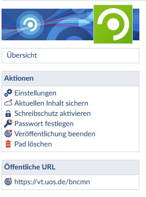Über die Aktion Veröffentlichen können Sie eine URL erzeugen, mit deren Hilfe Sie das Pad auch mit AnwenderInennen außerhalb von Stud.IP teilen können. Sie können die nun erschienene öffentliche URL kopieren und beispielsweise per E-Mail an externe Teilnehmende verschicken. Schließlich haben Sie natürlich auch die Möglichkeit das Pad, und damit das Dokument, zu löschen, indem Sie auf Pad löschen klicken.