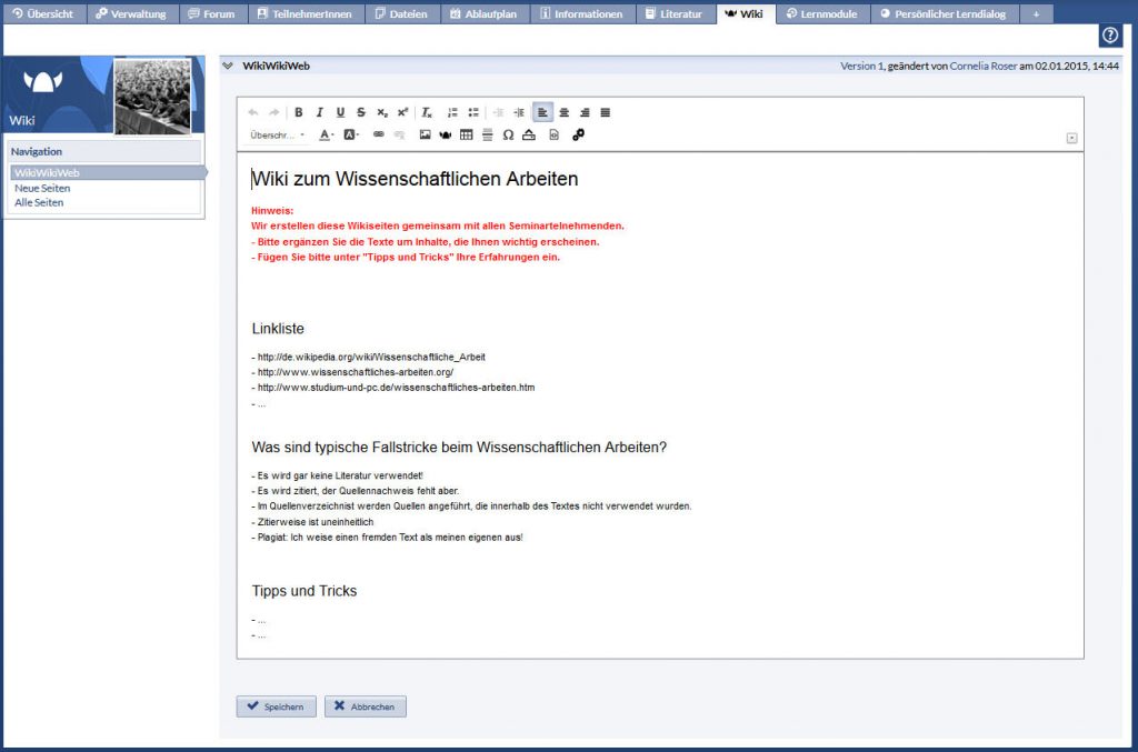 Das Wiki ermöglicht ein gemeinsames, asynchrones Erstellen und Bearbeiten von Texten. Texte lassen sich formatieren und miteinander verknüpfen, sodass ein verzweigtes Nachschlagewerk entsteht.