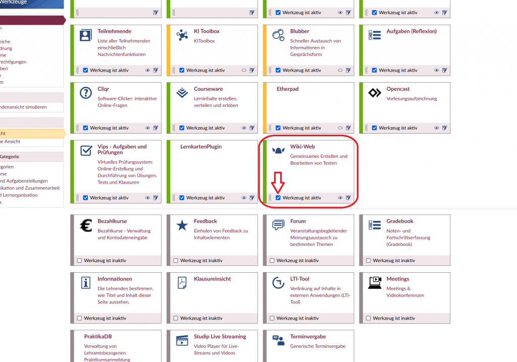 Um Wikis zu nutzen, brauchen Sie lediglich einen Computer mit Internetzugang. In jeder Veranstaltung in Stud.IP ist bereits ein einfaches Wiki integriert. Dieses können Sie ganz einfach in Ihrer Veranstaltung unter dem Reiter „Verwaltung“ und dann „Wiki-Web“ für Ihren Kurs freischalten.