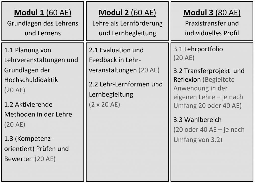 Es umfasst Workshops im Umfang von 200 Arbeitseinheiten (je 45 Minuten) aus verschiedenen Themenbereichen sowie ein begleitetes Lehrprojekt, in dem das Gelernte auf die eigene Lehre angewendet wird. Hierbei kommen weitere Formate wie kollegiale Hospitation, Teaching Analysis Poll sowie schriftliche Konzeption, Dokumentation und Reflexion zum Einsatz.