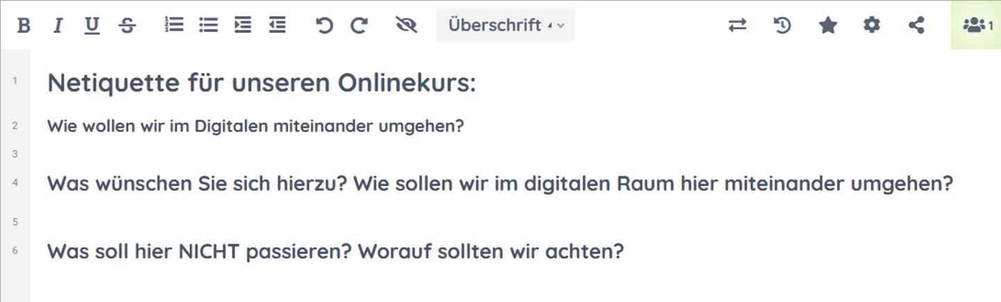 Wir möchten Ihnen empfehlen, sich in der ersten Sitzung dafür ca. 15 Minuten Zeit zu nehmen und diese mit Ihren Kursteilnehmenden zusammen auszuhandeln. Lassen Sie alle Teilnehmenden zu Beginn 5 Min. alleine für sich aufschreiben, welche Dinge sie sich im Onlineumgang miteinander im Kurs wünschen und was vermieden werden sollte. Sammeln Sie danach die Informationen im Plenum ein, z. B. anonymisiert auf einem vorbereiteten Etherpad, wie es unten zu sehen ist: