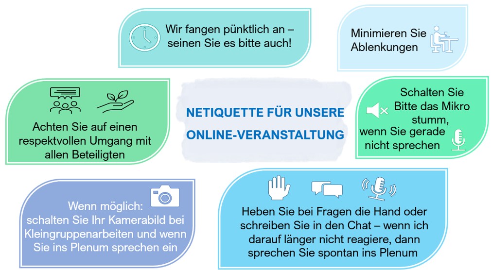 • Präsentieren oder handeln Sie Kommunikationsregeln mit Ihren Teilnehmenden aus (Netiquette).