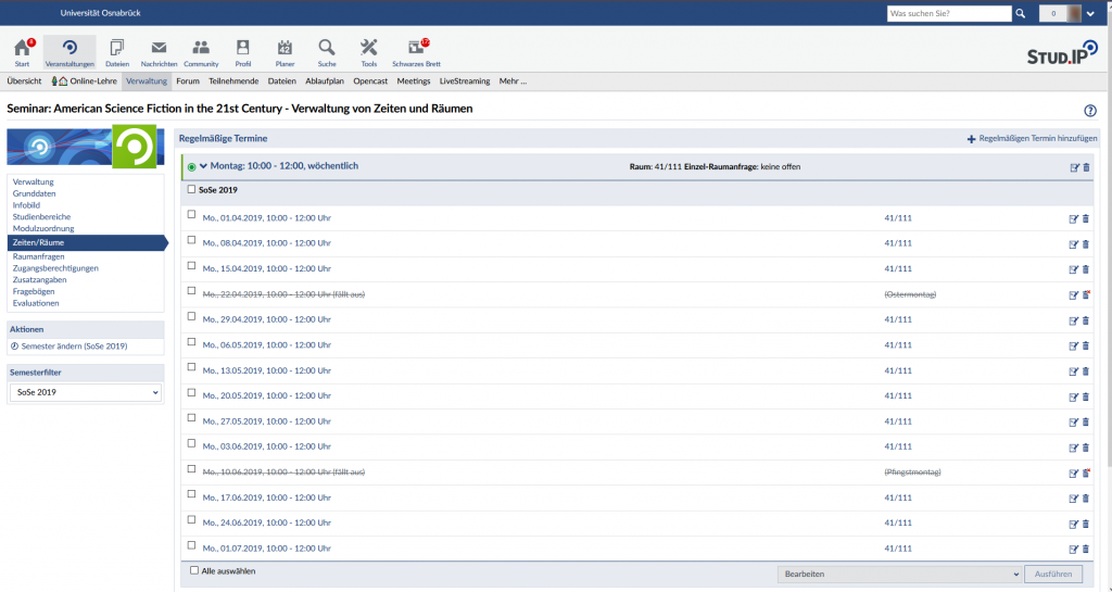 Stud.IP bietet vielfältige Optionen zur Einrichtung und Verwaltung von Veranstaltungen. Die wichtigsten Funktionen führen wir hier auf, Details zu den Möglichkeiten finden Sie am einfachsten allerdings immer in der Stud.IP Hilfe zum Thema „Veranstaltungen verwalten“.