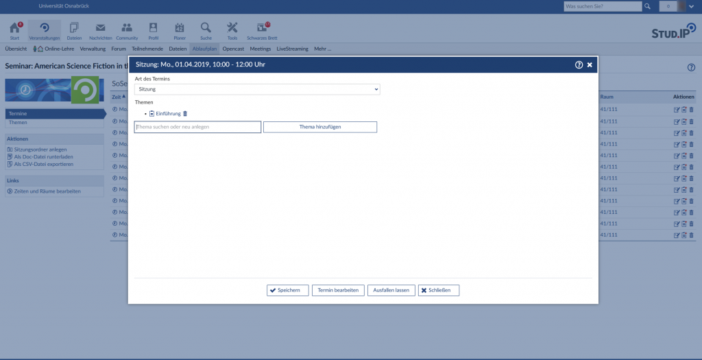 Der Reiter „Ablaufplan“ ist automatisch mit den angelegten Terminen der Veranstaltung gefüllt (siehe „Termin- und Raumverwaltung“) und gibt so einen Überblick über den zeitlichen Verlauf der Veranstaltung. Beachten Sie bitte, dass Sie hier keine neuen Termine anlegen können. Dazu klicken Sie einfach in der linken Spalte auf „Zeiten und Räume bearbeiten“, um zur Termin- und Raumverwaltung zu wechseln. Es ist allerdings möglich, direkt im Ablaufplan einzelne Termine durch einen Klick auf das jeweilige Datum und den Knopf „Termin ausfallen lassen“ abzusagen. Hier können Sie auch optional die Studierenden direkt per Rundmail über den Grund des Ausfalls informieren.