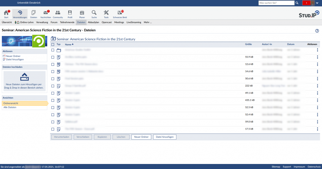 Die Dateiablage ist eine der sicherlich meist genutzten Funktionen von Stud.IP. Die Nutzung ist denkbar einfach: Sie laden eine Datei von Ihrem Rechner hoch und alle Teilnehmenden der Veranstaltung erhalten Zugriff darauf. Die Daten lassen sich noch in Ordner sortieren und der Upload ist auch per Drag & Drop in ein Feld in der linken Spalte möglich. Einzig die Lizenz für das von Ihnen hochgeladene Material muss noch angegeben werden. Diese Funktion steht auch den Studierenden zur Verfügung, so dass sie ihre Arbeitsergebnisse mit den Lehrenden und anderen Studierenden leicht teilen können.