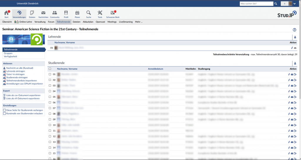 Diese Funktion dient der Verwaltung der eingetragenen Teilnehmenden, der Warteliste und der Einteilung in Gruppen. Die wichtigsten Funktionen sind ganz offensichtlich: der Reiter zeigt eine Liste mir allen Teilnehmenden einer Veranstaltung und Details zu diesen Personen. Darüber hinaus lässt sich hier aber auch mit einem Klick auf „Rundmail schreiben“ auf der linken Seite im Kästchen „Aktionen“ eine Nachricht an alle Teilnehmenden verschicken – hierbei kann auch der Empfänger*innen-Kreis feiner eingestellt werden. Rundmails sind der einfachste und direkteste Weg alle Teilnehmenden zu erreichen. Darüber hinaus können natürlich auch Teilnehmende ein- und ausgetragen werden, zu Tutor*innen hoch- oder zu Leser*innen herabgestuft werden und die Listen der Teilnehmenden im- und exportiert werden.