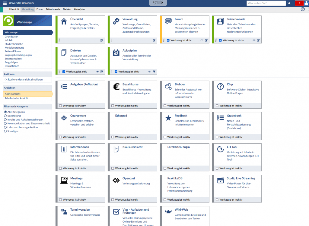 Im Bereich „Werkzeuge“ der Verwaltungsseite lassen sich die verschiedenen Reiter und Plugins Ihrer Stud.IP-Veranstaltung organisieren. Per Checkbox aktivieren und deaktivieren Sie bestimmte Werkzeuge, wie bspw. die Courseware. Über die Anfasser der jeweiligen Kacheln können Sie die Werkzeuge individuell sortieren. Mit dem Auge-Symbol haben Sie die Möglichkeit, einzelne Werkzeuge zwar zu aktivieren, aber für die Studierenden im Kurs unischtbar zu schalten. Über das Farbcodesystem sehen Sie auf einen Blick, welche Werkzeuge gerade aktiv und sichtbar (grün) bzw. unsichtbar (gelb) sind (nicht aktive Werkzeuge sind grau markiert).