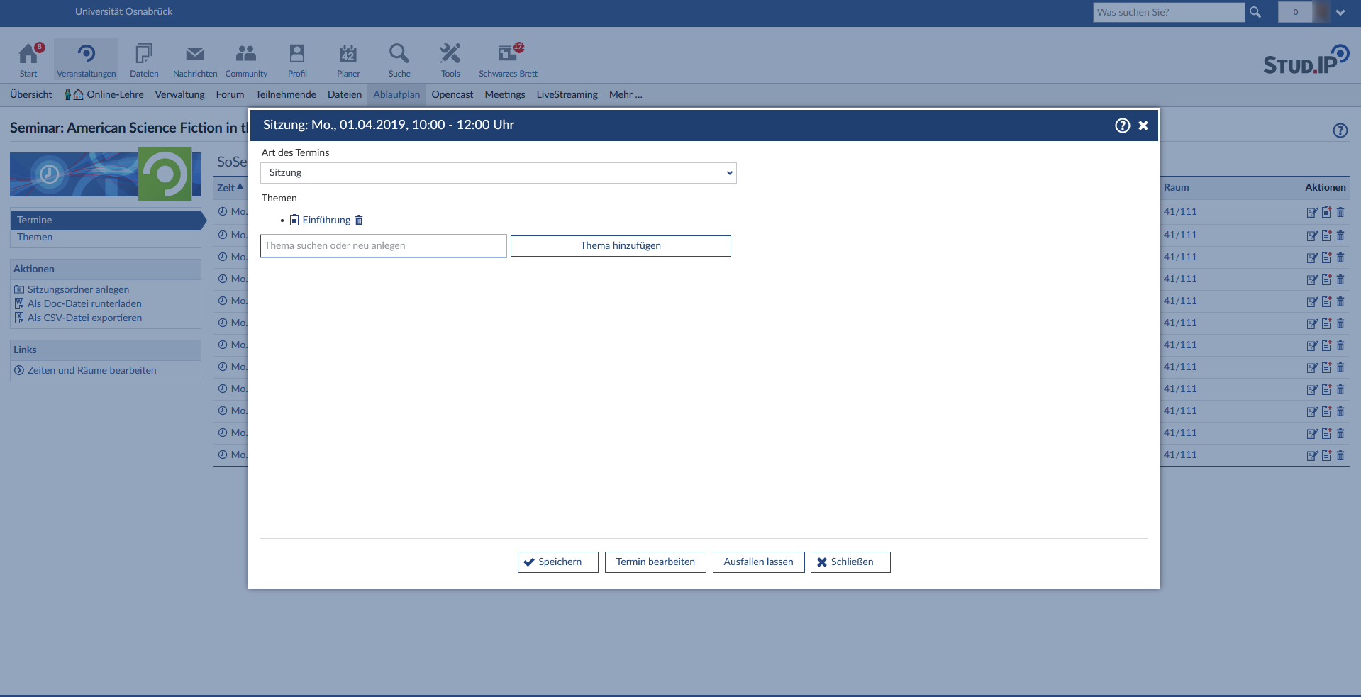 Der Reiter „Ablaufplan“ ist automatisch mit den angelegten Terminen der Veranstaltung gefüllt (siehe „Termin- und Raumverwaltung“) und gibt so einen Überblick über den zeitlichen Verlauf der Veranstaltung. Beachten Sie bitte, dass Sie hier keine neuen Termine anlegen können. Dazu klicken Sie einfach in der linken Spalte auf „Zeiten und Räume bearbeiten“, um zur Termin- und Raumverwaltung zu wechseln. Es ist allerdings möglich, direkt im Ablaufplan einzelne Termine durch einen Klick auf das jeweilige Datum und den Knopf „Termin ausfallen lassen“ abzusagen. Hier können Sie auch optional die Studierenden direkt per Rundmail über den Grund des Ausfalls informieren.