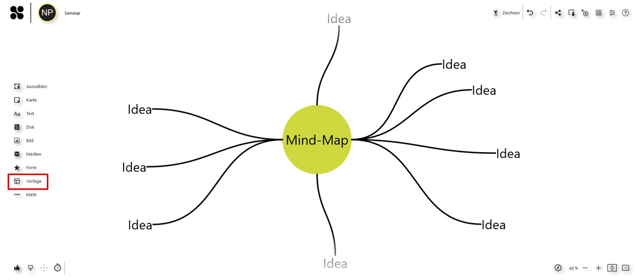 Es ist aber auch möglich, mit Vorlagen in Collaboard zu arbeiten, die eine Strukturierung erleichtern, wie z.B. mit diesem Mindmap, das Sie beliebig erweitern und bearbeiten können.