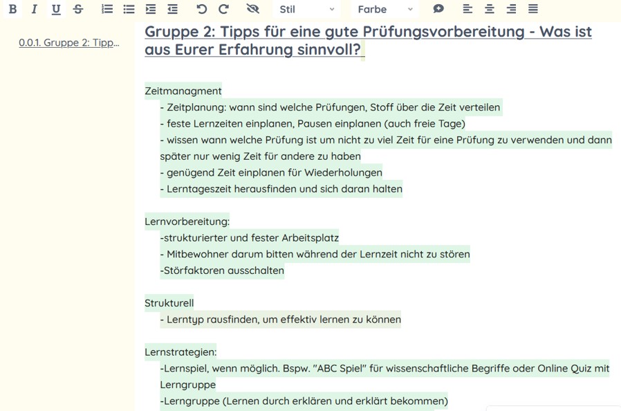 Auch bei ‚normalen‘ Gruppenarbeiten – in Präsenz- und Onlinelehrveranstaltungen – können Sie das Etherpad gut nutzen, um das Zusammentragen der jeweiligen Arbeitsergebnisse zu vereinfachen und effizienter zu gestalten, indem Sie bspw. alle Kleingruppen ihre Arbeitsergebnisse in einem gemeinsamen Pad zusammenführen lassen.
