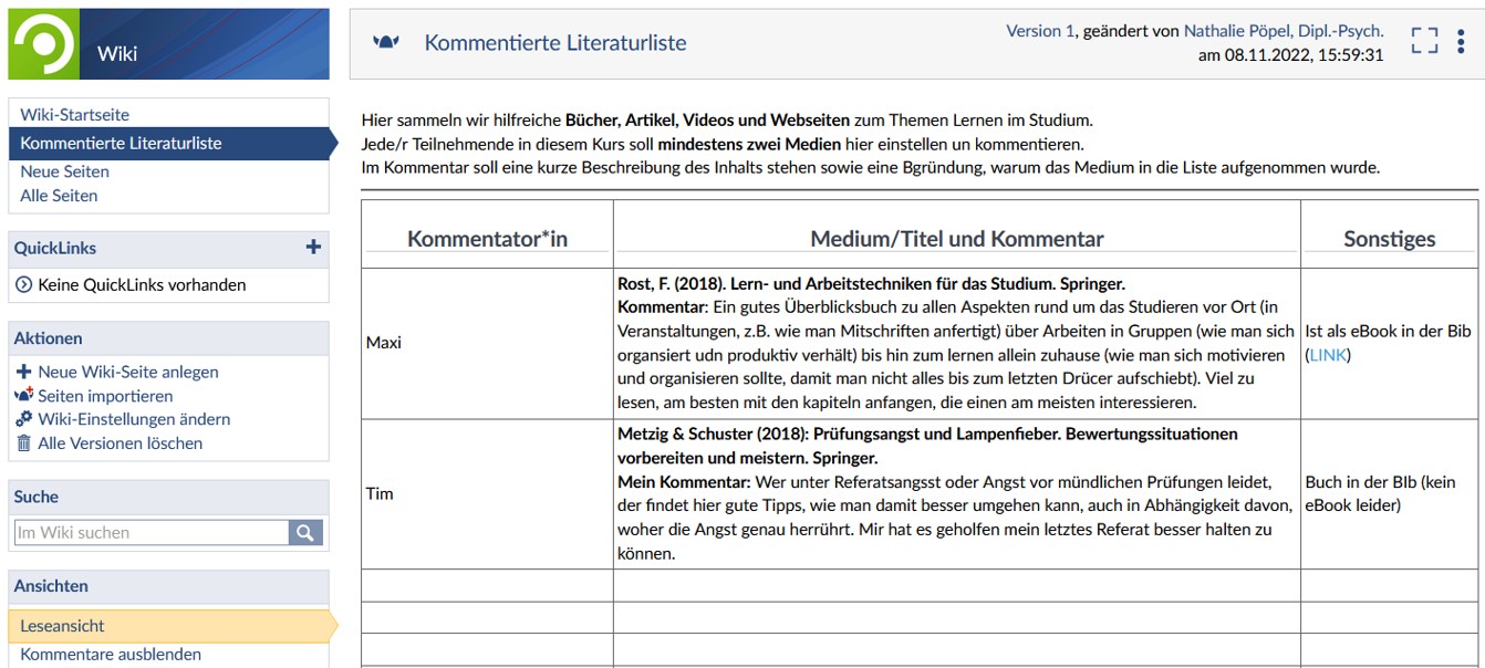 So können auf unkomplizierte Weise kommentierte Literaturlisten, Fach-Glossare oder Frage-Antwort-Sammlungen über den Verlauf eines Kurses gemeinsam erarbeitet werden.