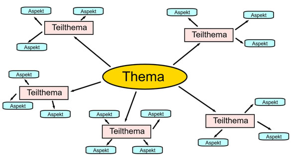 | Ablauf | Auf der Tafel oder einer anderen zentralen Sichtfläche wird in der Mitte das neue Thema notiert und (z.B. durch Umkreisung) hervorgehoben. Anschließend sollen die Studierenden alle Begriffe und Ideen nennen, die ihnen spontan einfallen. Diese werden an der Tafel um das Thema herum notiert. Dabei kann es erwünscht sein, dass die Studierenden sich mit ihren Beiträgen gegenseitig beeinflussen und inspirieren. Nach einigen Minuten wird die Sammelphase beendet, und die Lehrperson lenkt die Aufmerksamkeit auf die Gesamtheit des entstandenen Tafelbildes. |