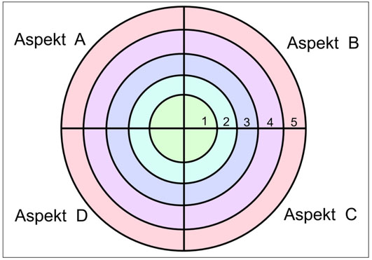 | Ablauf | Auf einer geeigneten Anzeigefläche ist eine Zielscheibe mit ca. vier bis sechs Kreissegmenten (»Tortenstücken«) zu sehen, die von innen nach außen in ca. fünf Bewertungsstufen unterteilt sind. Die Kreissegmente wurden am Rand mit den zu bewertenden Aspekten beschriftet. Die Bewertungsstufen sind von innen nach außen mit den Zahlen 1 (»stimme vollkommen zu«) bis 5 (»stimme gar nicht zu«) gekennzeichnet. Die Lehrperson erläutert den Studierenden die Nutzung der Zielscheibe. Alle Teilnehmende setzen nun in jedem Segment (d.h. für jeden Aspekt) jeweil einen Klebepunkt auf die Bewertungsstufe, die sie für angemessen halten. Durch die Häufigkeitsverteilung der Punkte entsteht nun ein anschauliches und detailliertes Bild davon, wie die verschiedenen Aspekte von der Gruppe gesehen werden. |
