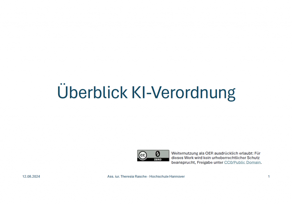 Thersia Rasche ist Juristin an der Hochschule Hannover und gibt in diesem Foliensatz einen Überblick über die verschiedenen Aspekte der KI-Verordnung der EU, die seit dem 1. August 2024 in Kraft ist.