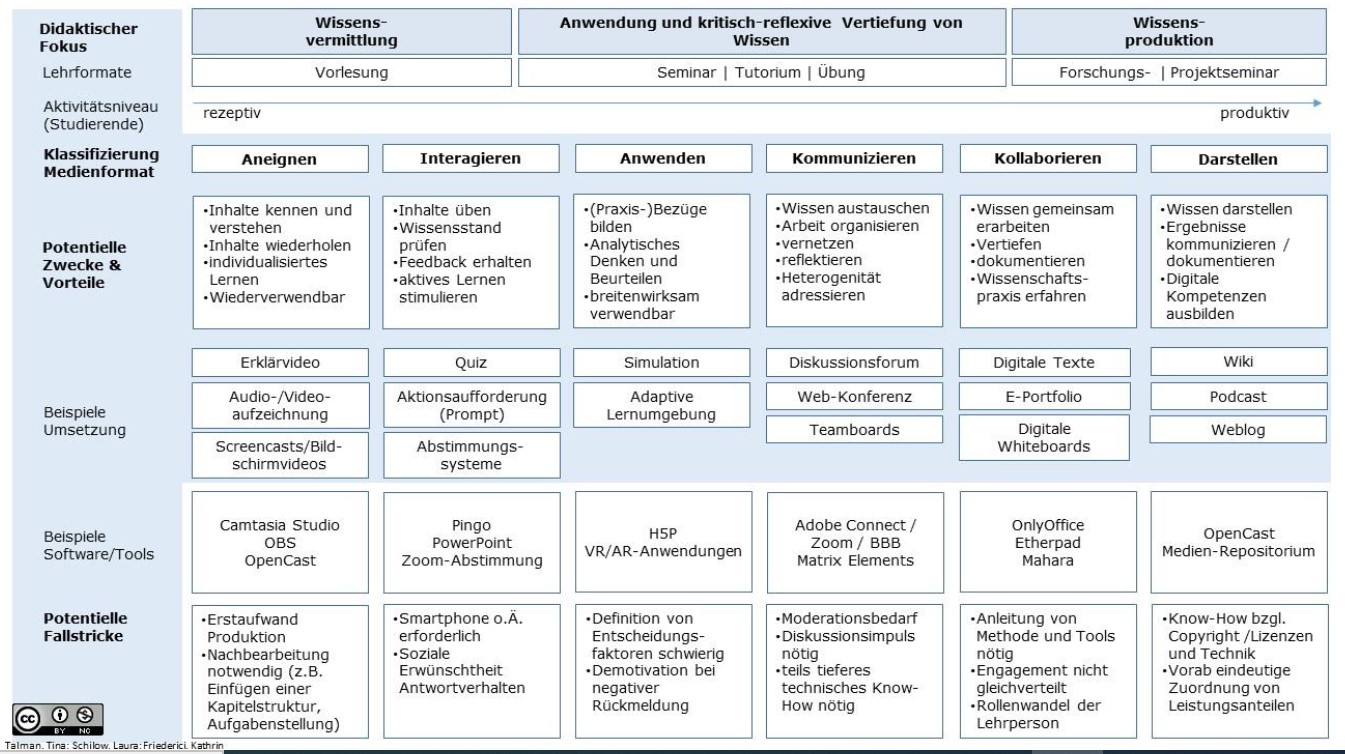 Talmann und Schilow (2020) haben die Auswahl passender digitaler Tools und Medien in Abhängigkeit von den didaktischen Schwerpunkten und Lehrformaten in ihrem Orientierungsbeispiel in den Fokus genommen: