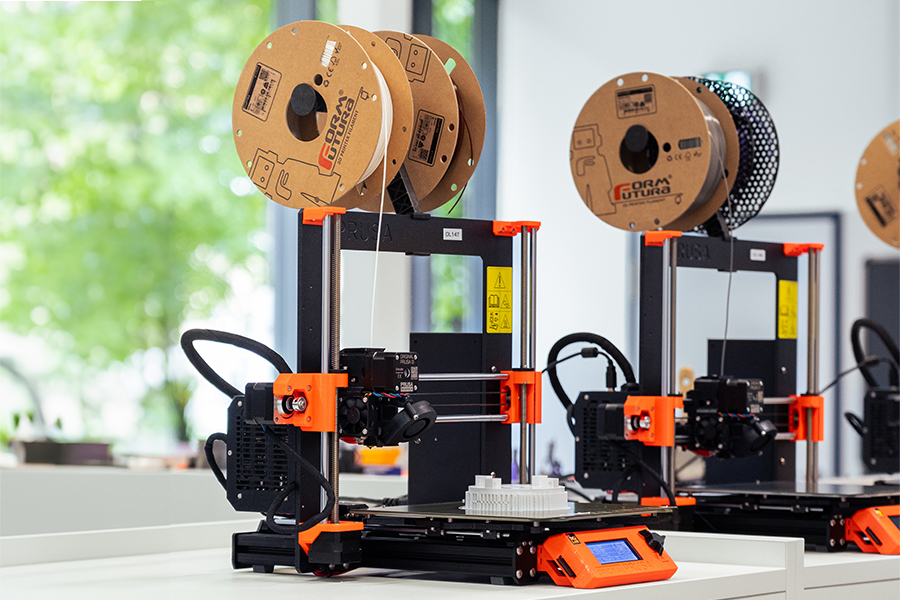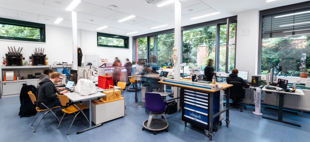 - Der „Makerspace“ – einen Werkstattbereich und Arbeitsraum mit neuartiger Technik wie z.B. 3D-Drucker, Lasercutter und Stickmaschine, um auch kollaborative und interdisziplinäre Zusammenarbeit zu unterstützen